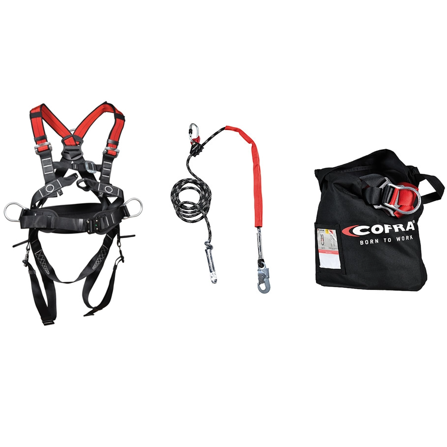 Το κιτ για κεκλιμένες επιφάνειες Cofra Cormonos, είναι ειδικά σχεδιασμένο για εργασία σε κεκλιμένες επιφάνειες. Περιλαμβάνει ζώνη ασφαλείας με ζώνη μέσης και ιμάντα συγκράτησης & τοποθέτησης εργασίας 5 m, προσφέροντας ασφάλεια και σταθερότητα κατά την εργασία.