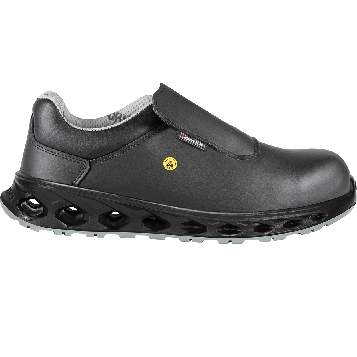 Ανατομικά μαύρα παπούτσια ασφαλείας Cofra Sanitation ESD S3S FO SR. Με προστασία δαχτύλων και υδατοαπωθητικό κορμό που εξασφαλίζουν ότι τα πόδια σας παραμένουν στεγνά και ασφαλή καθ 'όλη τη διάρκεια της εργασίας. Αντιολισθητικά κατηγορίας SR, χάρη στην εξωτερική σόλα από διπλή πολυουρεθάνη που προσφέρει μεγάλη πρόσφυση σε ολισθηρές επιφάνειες. Άνετα και πρακτικά, με υψηλή διαπνοή, είναι κατάλληλα για πολύωρη χρήση σε ξενοδοχεία, υπηρεσίες catering, βιομηχανίες τροφίμων κλπ. Πλένονται στο χέρι στους 40οC με ουδέτερο σαπούνι.